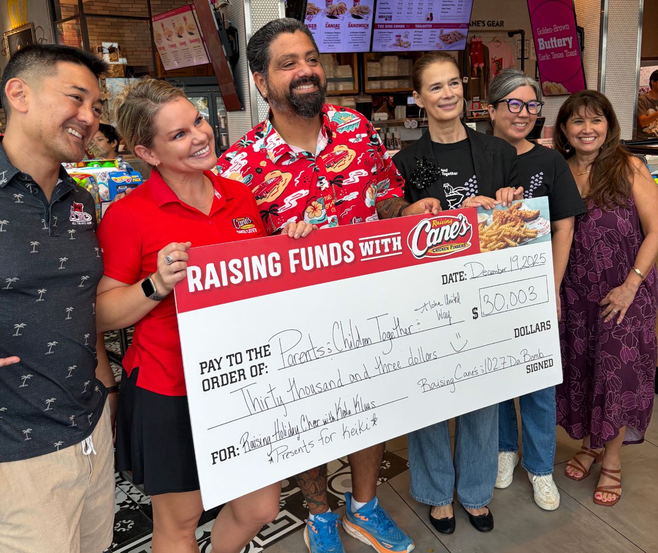 It was another successful year of Keola Klaus! We were able to grant wishes for Chavah from Ewa Beach, Evonne from Wahiawa and Lahela from Ewa Beach! With the help our our generous island community, we were able to present PACT Hawaii with a check for $30,003 to help even more local families! Mahalo to Raising Cane’s, Aloha United Way, Coastal Appliance Co., and Thinker Toys!